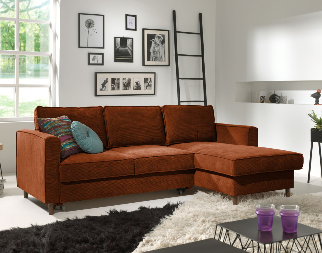 • Canapé d'angle droit convertible avec coffre 4 places en velours côtelé Jake