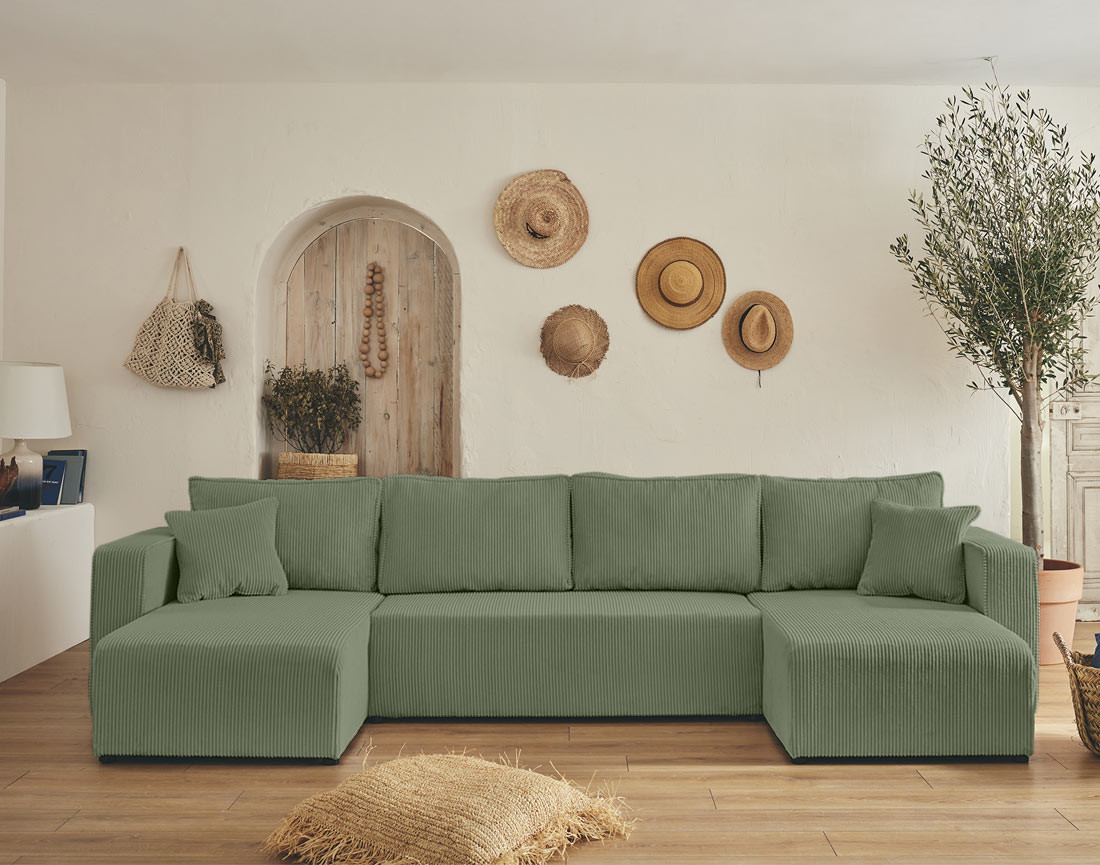 Topaze - canapé panoramique en U - 7 places - convertible avec coffre - en velours côtelé - vert sauge
